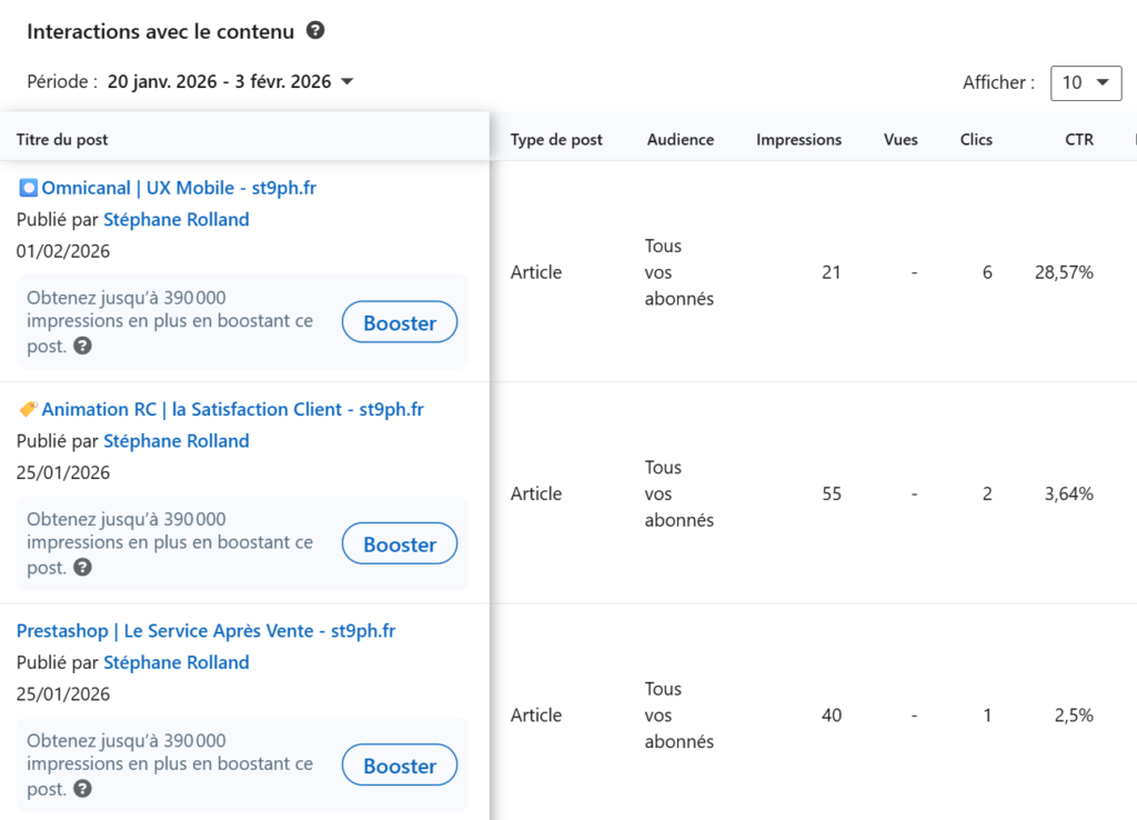 Ci-dessous, le choix statistiques de mon tableau de bord Linked In me permet de surveiller les KPI de mes publications :