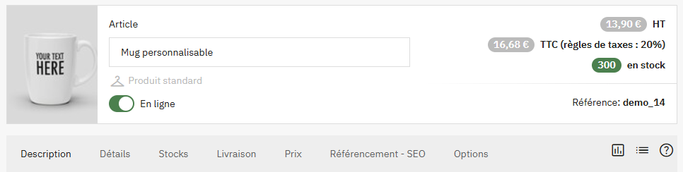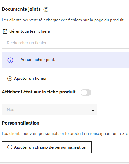 L’onglet détail regroupe maintenant tous les champs de personnalisation du produit (qu’on trouvait avant dans Options :