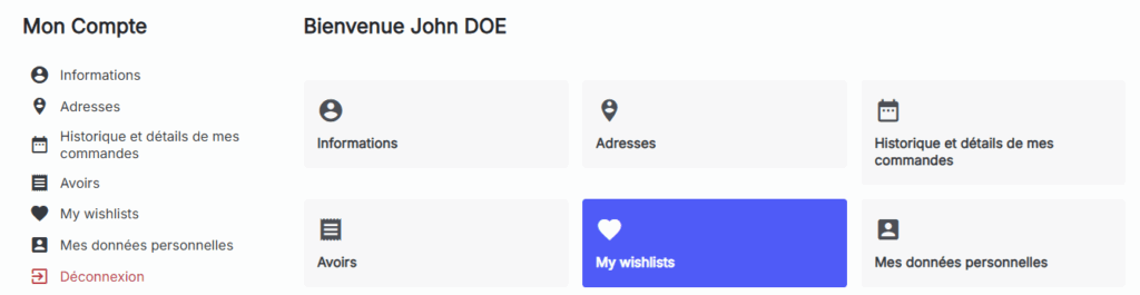 La liste d’envies « WishList » est disponible pour le client dans son espace personnel afin qu’il puisse retrouver sa présélection (et la commander) sans avoir à reparcourir tout le catalogue.