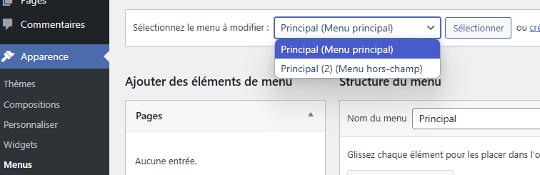 Deux menus ont été auto générés par Astra : Principal et principal2