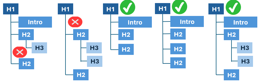 - H pour La Hiérarchie des titres. Vos titres doivent respecter une structure comportant au moins deux sous-parties précédées par une introduction