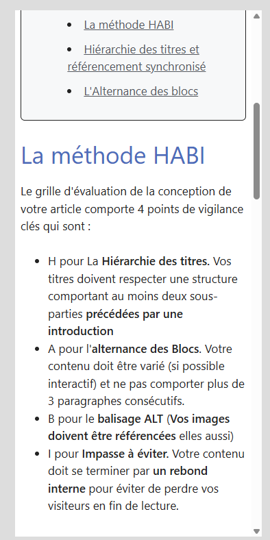L’objectif est de faire défiler votre contenu sans qu’à aucun moment, vous ne soyez en présence de paragraphes seuls (ennuyeux à la longue et qui risquent donc de provoquer un rebond). 6 visiteurs sur 10 vous liront sur un écran de moins de 7 pouces.