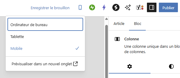 - Dans la barre supérieure, à droite, vous pouvez visualiser un aperçu de votre contenu en mode smartphone (mobile).
