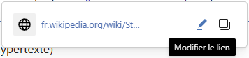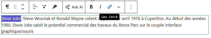 Dans l’exemple ci-dessous, on va créer un lien vers la page Wikipédia de Steve Job, ce qui activera le flag « liens externes » en vert