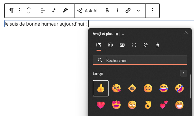 La manipulation est simplissime sous Windows. Durant votre saisie dans une bloc paragraphe ou autre, à l’endroit ou vous voulez voir apparaitre le smiley :