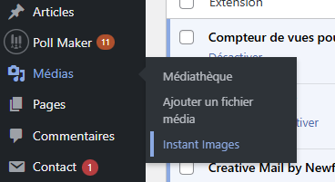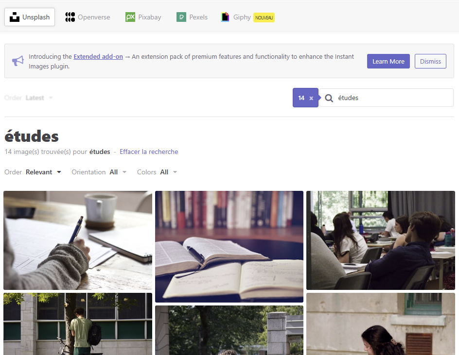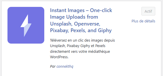 Instant Images est une extension gratuite qui permet de téléverser directement des images des bibliothèques en ligne gratuites (libres de droit). Unsplash, Openverse, Pixabay, Pexels et Giphy.